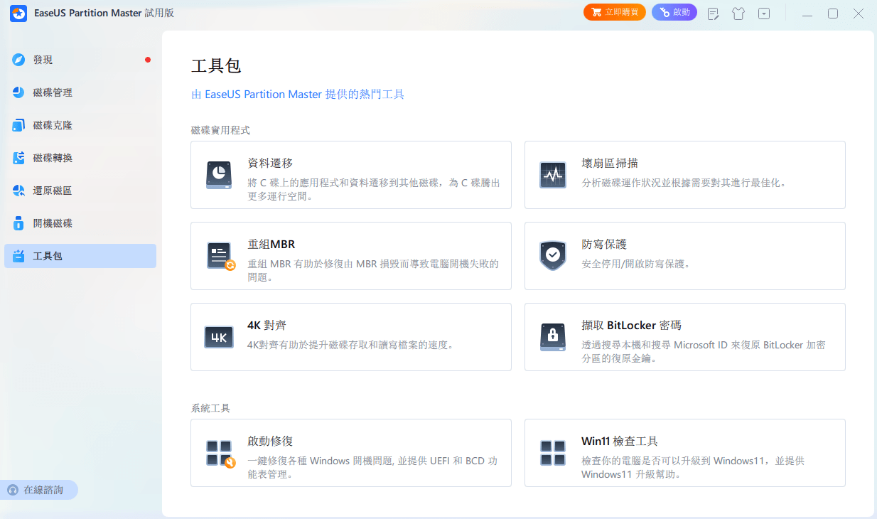 引导管理:可以帮助用户修复引导问题、更改启动分区、重新创建引导记录等操作。